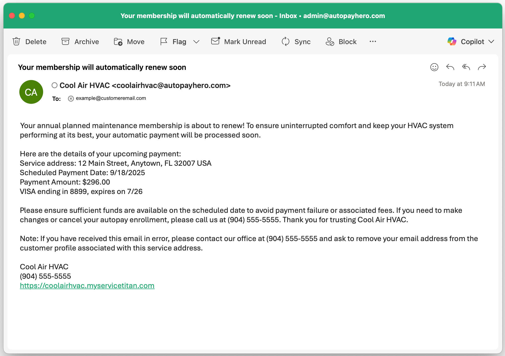 AutoPayHero was built to do one thing for businesses running ServiceTitan: Automatically send renewal notification emails to your annual ongoing membership customers at the exact right time to comply with state credit card subscription laws.Say goodbye to the time and cost of manual emails or mailers. Simplify your office procedures and protect your business using AutoPayHero.
